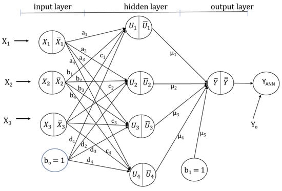 The linear transformation is used to provide the normalized output value, , to ensure while the final output YANN is obtained after is denormalized to produce the following explicit Equation (8).