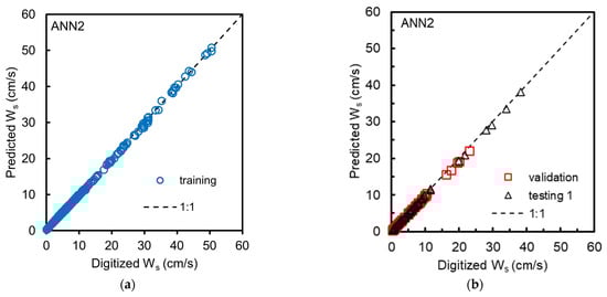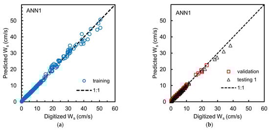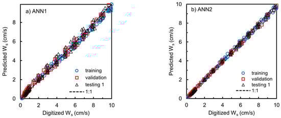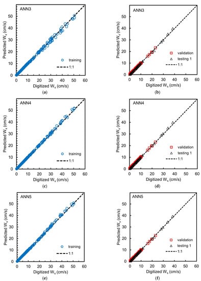 Figure 2, Figure 3 and Figure 4 show the scatter plot between the predicted settling velocity and the digitized data from the Interagency Committee’s charts for training, validation, and testing 1 for the ANN1 to ANN5 models, respectively. Moreover, the statistical measures of the simulation results for the training, validation, and testing 1 of the five ANN models are provided in Table 8.