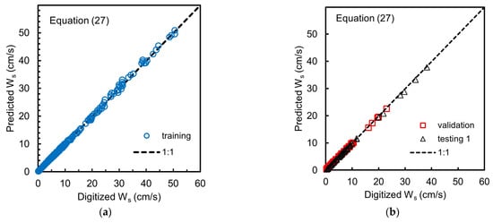 Scattering plot for results of model training (a); validation and testing 1 (b) for simplified ANN5, Equation (27).