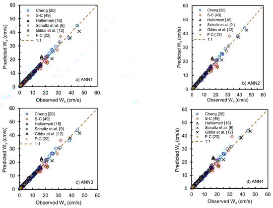 Table 10 presents the statistical values of the results of testing 2 for the five models, ANN1 to ANN5, as well as the three existing equations reviewed, Jiminez and Madsen [21], Wu and Wang [11], and Camenen [23], and also the simplified ANN4 Equation (26) and simplified ANN 5 Equation (27), respectively. Plotting between Ws predictions and data is given in Figure 8, Figure 9 and Figure 10. As in the previous test results, ANN3 and ANN4 give slightly more accurate results than other proposed ANN. The MRE, MAXRE, and RMSE values of results of ANN3 and ANN4 are lower than other ANNs. The simulation results also show that ANN2 and the formula of Wu and Wang [11] provide MRE, MAXRE, RMSE, and R2 values close to each other. It is not surprising because the Wu-Wang formula [11] was also developed using the Interagency Committee’s charts as a reference. Shankar et al. [50] also conclude that the Wu-Wang model predicts the settling velocity of sediment particles better than the 14 existing models reviewed in their comparison study. Through visual observations in Figure 9, the results of plotting the models of Jeminez-Madsen [21] and Camenen [23], there are quite large deviations in some data with Ws between 40 to 50 cm/s. Surprisingly, the simplified model of ANN4 Equation (26) and ANN5 Equation (27) produce statistical measures nearly the same as its full equation (Figure 8d and Figure 9e).