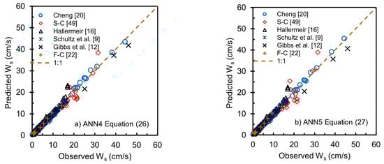 The above results indicate that the simplified ANN4 Equation (26) and simplified ANN5 Equation (27) can potentially be used to predict the settling velocity of natural sediments, especially for those sediment quartz with diameters between 0.05 mm and 10 mm in water having temperatures between 0 °C and 40 °C and the shape factor ranging between 0.5 and 0.95 with reasonable accuracy.