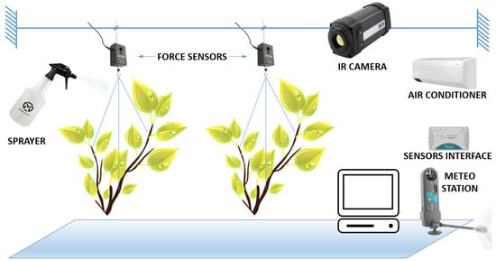 Figure 1 shows the experimental layout where for branches of lemon trees (Citrus limon (L.) Osbeck), interception capacity, S (mm) and evaporation depth E (mm), starting from S, were measured. For each run, two branches of lemon trees that were not wilting were selected from the field. After the selection, each was cut, taken immediately to the laboratory and weighted. By using a thin nylon thread (0.3 mm), for data acquisition, the dry branches were suspended on the balance arrangement by using two force sensors connected to an interface with a range of ±10 N and a sensitivity of 0.01 N, as shown in Figure 1. A weather sensor was also connected to the interface for temperature and relative humidity data acquisition. Temperature and relative humidity were imposed by using a common air conditioner, which was employed to mimic different climatic conditions. A thermal camera, FLIR A320 (IR camera), was also used to monitor the evaporation process.