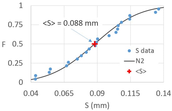 For the considered 22 runs, frequency distribution and normal distribution, N2, of the interception capacity, S. The mean value <S> is also indicated.