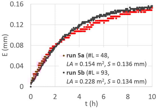 For example, Figure 3 shows the E versus the time relationship, corresponding to run 5a and 5b, thus sampled at the same time, providing very close S values (0.136 and 0.134 mm, respectively), despite the different number of leaves, #L, and leaf surface area, LA, values, as displayed in Figure 3. However, in the case of Figure 3, it can also be observed that the evaporation depth of the wet canopy exceeds the interception capacity (S). This occurrence was probably due to the transpiration effect, meaning that for run 5, the branches lost more water than that evaporated from the wet leaves.