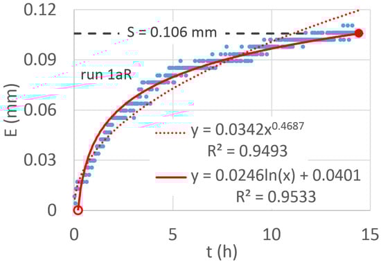 As an example, for E experimental data vs. time, obtained for run #1aR, Figure 4 shows the comparison between the fittings of the power-law (Equation (2)) considered by Baiamonte [23] and of the semi-log relationship (Equation (6)). For the latter, t0 (red circle) and tmax (red dot) and the corresponding interception capacity, S, are also indicated. Although high coefficients of determination were obtained for both cases, it can be observed that the power-law overestimated the evaporation near to the S achievement.