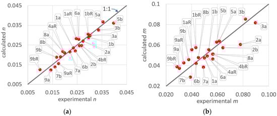 For the 22 runs, comparison between the parameters obtained using the ordinary least squares method applied to the experimental pairs (E,t) and those calculated (a) using Equation (12) for the n parameter and (b) using Equation (13) for the m parameter.