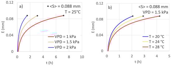 For a fixed S equal to the mean value (S = 0.088 mm) and for T = 25 °C, Figure 6a shows E versus t, for different VPDs (VPD = 1, 1.5 and 2 kPa, Figure 6a), whereas in Figure 6b, for VPD = 1.5 kPa, E versus t is plotted for different Ts (T = 20, 24 and 28 °C). The figure shows that for both VPD and T, the expected trends occur, indicating the suitability of the calibrated model, and thus the influence on the evaporation process by the considered physical variables. However, it seems that VPD has greater importance than T, also supported by the ANOVA, at least in the considered range of the investigated variables.