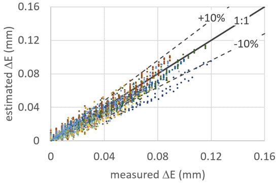 Because of the high number, n, of the experimental E values, N22 = Σ Nr = 2812 disaggregated data were obtained and compared with the data calculated using Equation (18). The results of the comparison are reported in Figure 7, where the line of perfect agreement is also indicated. The standard error of the estimate, SEE, of ΔE was equal to 0.007 mm, which is not much if considering the complexity of the studied process. In the same Figure 7, two straight lines bounding the domain corresponding to a maximum estimate error equal to ±10% are plotted. Excluding the minor number of cases, the points fall inside of this field, proving the reliability of the suggested procedure.