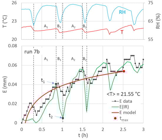 For the runs carried out with low values of the mean temperature (such as #4aR, #4bR, #7a and #7b), the non-monotonic behaviour of the E temporal variation was observed. As an example, for run 7b, for which a slight T variability occurred (<T> = 21.6 °C), Figure 8 shows that the experimental E values started increasing and then decreasing versus the time, mostly because of the RH and VPD variations that were determined by the air conditioner, which maintained the temperature using a temperature sensor associated with a controller. It is known that the sensor read the return air temperature from the room which was air-conditioned and the controller compared it with the set point. Once the set point was achieved the controller, cut down the compressor which in turn stopped the room being cooled more, and so on.