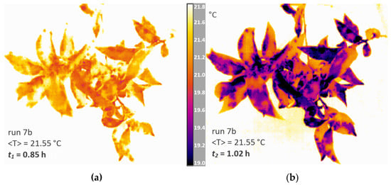 Two IR images corresponding to the times t1 and t2, for which highly different E values occurred, are plotted in Figure 9, where the same T scale at t1 = 0.85 h (Figure 9a) and, after 10 min, at t2 = 1.02 h (Figure 9b) was set. The latter made it possible to observe the condensation process during step B1 (Figure 8), thus validating the E versus t relationship obtained by the force sensors under T and RH conditions.