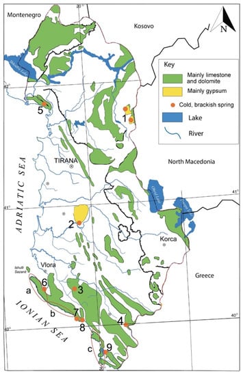 Location map of cold brackish springs in Albania. Springs in evaporitic deposits (halite-gypsum): 1, Korab; 2, Dumre; 3, Bashaj; 4, Glina. Springs in carbonate rocks: 5, Renci; 6, Marmiro; 7, Himare; 8, Qeparoi; 9, Butrint. Karst areas with diffusive drainage are bordered in red: (a) Karaburun; (b) Palase-Qeparoi; and (c) Ksamil-Gjuza (modified after [27,28]).