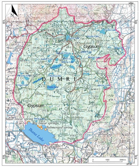 The Dumre dome covers an area of about 170 km2, with a rolling landscape and average relief of 130 m a.s.l. It is surrounded by Paleogene flysch formations and Miocene-Pliocene molasses, all with low hydraulic permeability. Elevation of the massif decreases southwards until the bottom of the Thana artificial lake (15–25 m a.s.l.). The gypsum dome produces a karst relief filled with landforms such as sinkholes, funnels, endorheic basins and lakes. The density of sinkholes in the southern plateau is 15–20/km2 [39,40,41], most of them being produced as collapse or solution sinkholes [42,43,44]. These processes at Dumre are still active today, locally representing a danger people’s safety [45,46,47]. Sinkholes with an initial depth of a few meters can evolve to reach 15 m in depth, at the same time widening; often transformed into lakes, they are the most distinctive landform of the Dumre plateau, which hosts about 80 karst lakes (most of them being permanent), for a total area of 7.70 km2. This is also typical of similar karst settings and poljes in other countries [48,49,50,51,52].