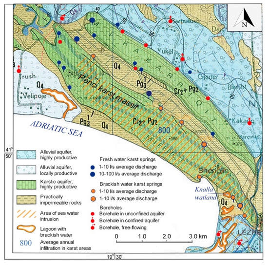 - Eftimi, R. Water Supply of South Albanian Coastal Area. Hydrogeological Investigation; World Bank Project: Washington, DC, USA, 2011. [Google Scholar]