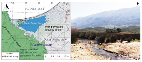 For the first group (lithological contact springs at sea level or above), the contact is created by carbonate rocks overthrusting the Paleogene-Neogene clay-sand/flysch formations. This type of contact is practically water-tight and prevents the sea-water intrusion. Usually, these springs are characterized by good hydro-chemical qualities, and are very important as water supply sources. This group includes springs Uji i Ftohtë near Vlora, the springs of Tragjasi, Borsh, and that of Sasaj-Piqeras [17,59].