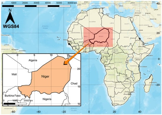 Niger is located between 11 and 24 degree North latitude and 0 to 16 degree East longitude (Figure 1). It is a landlocked country in West Africa with an area of 1,270,000 km2, with 80% of its area in the Sahara desert []. Niger has distinct wet and dry periods. The wet period starts around June to September and lasts for four months with the average precipitation varying significantly across the country, with lower values in the north in the Saharan desert zone, and higher values in the south Sahelo-Sudanian zone, with ranges from 150 to 800 cm per year depending on the area. The wet period is from July to August in the northern desert area of Niger []. The Niger River is the only permanent river in the country whereas the other rivers are ephemeral. There are anthropogenic drainage ponds and dammed reservoirs for surface water storage [].
