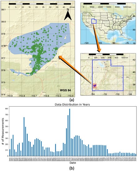 (a) The spatial distribution of the wells and (b) the temporal distribution of the measurements in years for the Beryl-Enterprise aquifer in Utah.