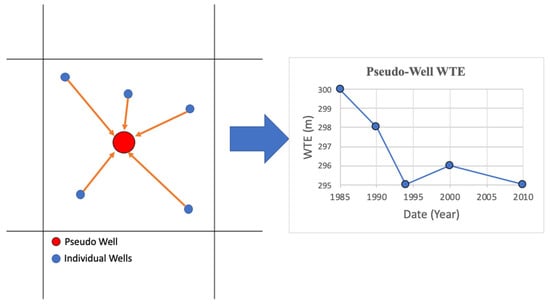 Groundwater levels tend to be relatively uniform over a certain distance and wells close to the pseudo-wells have values that are representative of that region. We assume that local variations resulting from this approach are acceptable, and that when these data are used to estimate storage changes for the entire aquifer over time, the error will be reasonable. This should be the case, because even if the pseudo-well time series is inaccurate, the general trends or changes should be representative.