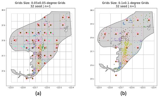 We included the first figure, Figure 13, that presents the grid clustering results for the 0.05-degree grid, in this section. We placed the other figures, which present results for the 0.1-degree grid, and the 0.25-degree grid in the Appendix A as Figure A1 and Figure A2, respectively.