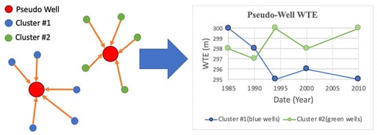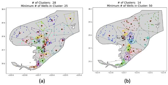 We implemented a modified version of the k-means clustering algorithm to generate groups of wells and their associated pseudo-well. This approach allows the spatial size of the cluster to vary and results in a more uniform number of wells for each pseudo-well (Figure 6). The k-means algorithm iteratively partitions a data set into a user-defined number (K) of distinct non-overlapping groups by iteratively changing cluster members to minimize the sum of the squared distance between the data points and the cluster’s centroid []. The traditional k-means algorithm can result in an uneven number of data points in each cluster. To ensure a more uniform distribution of wells to clusters, we used a modified version of the k-means algorithm called constrained k-means clustering that allows the minimum and/or maximum cluster member size to be specified []. The k-means method results in the clusters having different spatial sizes (area), unlike the grid clustering method. In regions where wells are sparse, clusters will be large in spatial extent, and in areas where wells are dense, the clusters will be smaller in spatial extent.