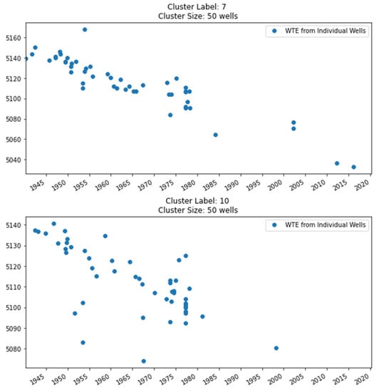Our method is simplistic in that it does not account for lithofacies in the clustering process and assumes all wells are in the same aquifer. The results could potentially be improved by factoring lithofacies into the clustering process. The WTE time series interpolation process may also benefit from correlation with rainfall data to minimize overshoot or undershoot.