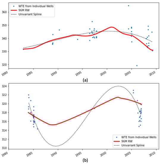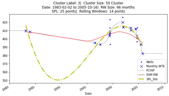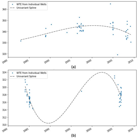 Even with a large fitting parameterfor time series that have a long gap between clusters of data points, such as the data set in Figure 9b, the univariate spline will often result in an overshoot and/or an undershoot regardless of the knot parameters. To address this issue, we used a different interpolation method called the Piecewise Cubic Hermite Interpolating Polynomial (PCHIP) []. PCHIP interpolation is often selected to interpolate and resample environmental data over other methods such as cubic splines or linear interpolation as it provides a continuous curve and does not exceed the local physical data bounds. In other words, the PCHIP interpolation does not create an overshoot or undershoot that commonly occurs with cubic splines. However, unlike the spline method proposed above, it honors all the data points, so any given date can only have a single point and this approach often creates wide oscillations in the interpolation as the interpolating spline moves from data point to data point. To resolve these issues, we first averaged the WTE values at each pseudo-well to unique monthly values for any month that had data and then applied the PCHIP interpolation to generate values at each month.