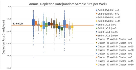 Figure 12 shows that the 500 realizations for any scenario exhibited high variance and resulted in a wide range of estimates. The plots (Figure 12) show that as the number of samples per well increased, the variation of the estimated storage depletion rates decreased. For every case, as the number of random samples per well increases, the interquartile range gets smaller. This means that even though the median value for the n = 1 scenario was closest to the published values, the scenarios with higher numbers, such as n = 25 result in a better estimate as the expected error is lower because of the decrease in variance of the ensemble.