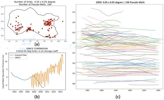 Using 0.05-degree square grid clustering, (a) spatial distribution of the pseudo-wells, (b) groundwater storage change comparison against the GGST GWSa, and (c) synthetic WTE time series of each pseudo-well.