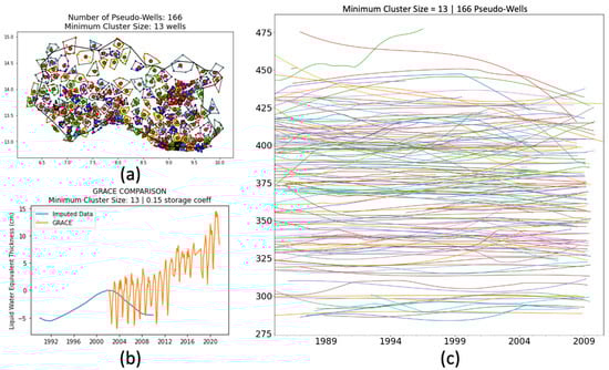 Using the k-means-constrained clustering with 13 minimum cluster size, (a) spatial distribution of the pseudo-wells, (b) groundwater storage change comparison against GRACE GWSa, and (c) synthetic WTE time series of each pseudo-well.