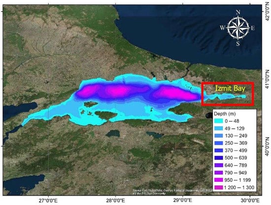 The Marmara Sea, which is a semi-closed basin, has a two-layer water system formed as a result of the water exchange between the Black Sea and the Aegean Sea. Since the salinity levels in neighboring seas are different, the salinity of the Black Sea waters flows in the thin layer on the surface of Marmara (0–25m), and below this layer, salty waters enter from the Aegean Sea. Surrounded by highly urbanized and industrialized cities, the Sea of Marmara, located on the main transportation route is under high pressure from household and industrial pollution. For several decades poorly treated wastewater of mega cities has been discharged into the sea. As selected for this study, Izmit Bay, located in the east part of the Sea of Marmara (Figure 2), is under the constant pressure of pollution. The Bay has a weaker circulation compared to the other parts of the Marmara Sea []. The deepest point is 208 m, located in the central part of the Bay. The main reason for the low oxygen content in the Bay is a load of organic matter deposited from the upper layer and the oxygen consumed because of the metabolic activities of the organisms in the lower layer [].