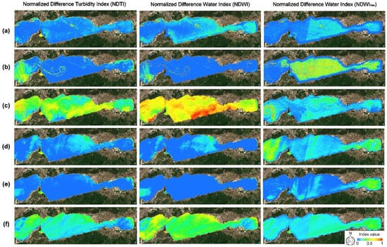 Estimated thematic maps of NDTI, NDWI and NDWIGao from Sentinel-2 images acquired on (a) 14 May; (b) 19 May; (c) 24 May; (d) 13 July; (e) 18 July; (f) 28 July 2021.