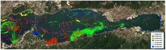 Temporal analysis of mucilage coverage on Izmit Bay was conducted using the best performing AFAI index by merging the detected mucilage areas on the seven dates considered in this study (Figure 6). Since the results were overlaid to each other, areas detected as mucilage by different indices were shown with the color of the latest date, which results in suppression of previous dates. For instance, eastern coastal areas were shown with blue color showing the mucilage-covered areas on 28 July, but these zones were also detected by the index from the 13 and 18 July images. As shown in the figure, a mucilage bloom was mostly observed on the north-west coast of the Bay, and then a thin creamy surface layer with a few kilometers long appeared throughout the Bay on 19 May. On 24 May, mucilage reached its maximum level covering a large proportion of the water surface.