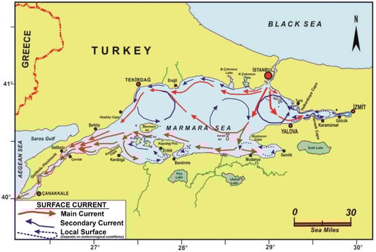- Beşiktepe, Ş.T.; Sur, H.İ.; Özsoy, E.; Latif, M.A.; Oǧuz, T.; Ünlüata, Ü. The Circulation and Hydrography of the Marmara Sea. Prog. Oceanogr. 1994, 34, 285–334. [Google Scholar] [CrossRef]
