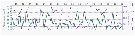 Wind speed and direction information for Izmit Bay between 17 May 2021 and 31 May 2021 (source: www.meteoblue.com, accessed on 15 June 2022).