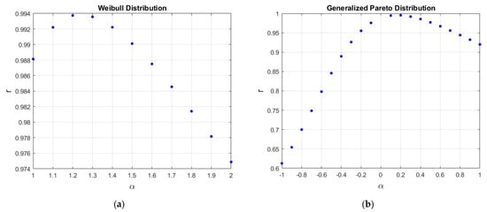 Correlation coefficient (r) values for different shape parameter values (α) for the selected candidate distribution functions. The maximum value of r gives the value of α of the candidate function that best fits the wave dataset: (a) Weibull distribution; (b) Generalized Pareto Distribution (GPD).