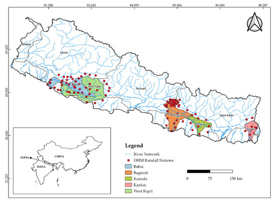 Nepal is a landlocked country surrounded between the Himalayas and the Gangetic plain. It comprises the Himalayas in the north, mountains/hills in the mid, and lowlands in the south [35]. The topography and climatic features vary significantly from north to south, causing high rainfall variation throughout Nepal [42]. The study domain includes Nepal’s five different basins (West Rapti, Babai, Bagmati, Kankai, and Kamala), as shown in Figure 1. These five basins are categorized as medium-sized basins based on their area and origin [43]. The summary information, including location, catchment area, and elevation of all basins, are tabulated in Table 1.