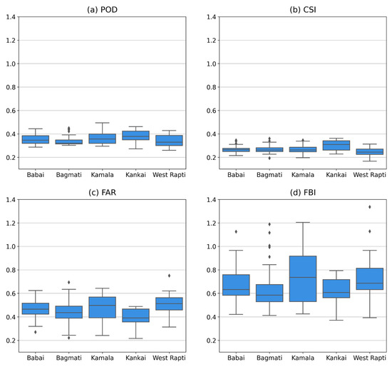 The POD values for all basins were low, with median values ranging between 0.32 and 0.38, indicating CHIRPS’ inability to detect the rainfall events in the entire study area (Figure 2). In particular, the Kankai basin shows comparatively higher POD values (median = 0.38) than the other four basins. The maximum POD was found to be 0.49 in the Kamala basin; this implies that CHIRPS detects less than 49% of the rainfall events in the study area. Likewise, the CSI values were not very promising as none of the basins had values above 0.36. The CSI values were considerably greater for the Kankai basin (median = 0.31). In contrast, CSI values for three basins (Babai, Bagmati, and Kankai) were almost similar, with a median of 0.26.