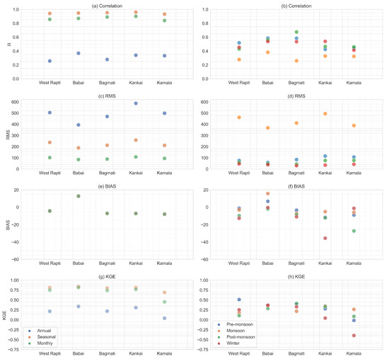 Figure 3 (left column) shows the scatter plots for statistical metrics (R, RMS, BIAS, and KGE) used to evaluate the performance of CHIRPS versus the observations made by rain gauges over different timescales from January 1986 to December 2015. Different colors indicate different time scales and seasons in the plots. CHIRPS performs well for the seasonal (R = 0.95) and monthly (R = 0.87) time scales with higher average values of R in comparison to the annual time scale (R = 0.31) (Figure 3). The reason for the good performance of the CHIRPS dataset might be the inclusion of station data in it [23]. The errors at the monthly scale are approximately symmetrical and cancel each other out after aggregation resulting in a higher correlation at the seasonal scale [55]. The average values from RMS at annual, seasonal, and monthly timescales for all basins were 490.19 (ranging from 394 to 586.32 mm), 221.3 (ranging from 189 to 257.71 mm), and 95.28 mm (ranging from 84.3 to 107.64 mm), respectively. In addition, the CHIRPS product underestimates rainfall over the annual, seasonal, and monthly timescales in all basins with an average BIAS of −6.63% (ranging from −7.95% to −4.30%) except in the Babai basin (+12.7%). Similar to the R-value, on average, the scatter plot of KGE shows a good agreement for the seasonal (KGE = 0.76) and monthly (KGE = 0.72) time scales, whereas a poor relation is seen for the annual time scale with an average KGE value of 0.21.