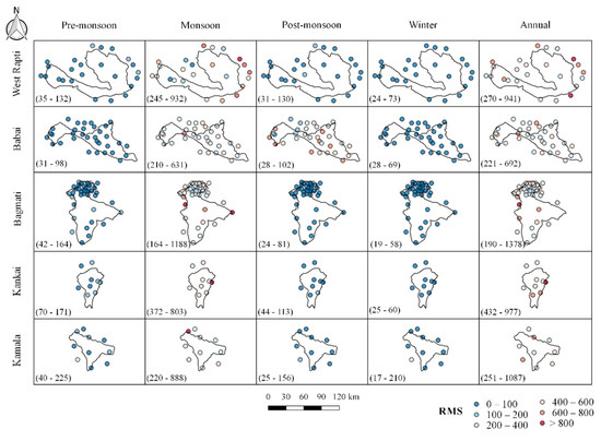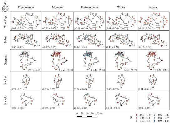 The annual and seasonal scale spatial distribution between CHIRPS satellite product and in situ rain gauge observation are presented in Figure 4, Figure 5, Figure 6 and Figure 7 for statistical metrics R, RMSE, percent bias, and KGE, respectively. Figure 4 displays the spatial variations of R over the five basins of Nepal. The CHIRPS data showed a better correlation for the northern part (Kathmandu Valley) of the Bagmati Basin. However, most rain gauges are concentrated on the northern side of the basin [59], so a spatial estimation of the entire basin is quite challenging. Further, weakly positive (negative) linear relationships were observed in all seasons in isolated parts. Further, the northern part of the Kamala basin has a comparatively good correlation in pre-monsoon, post-monsoon, and winter seasons compared to the south-eastern parts. In other basins, no significant spatial variability was observed.