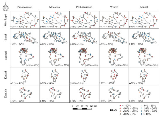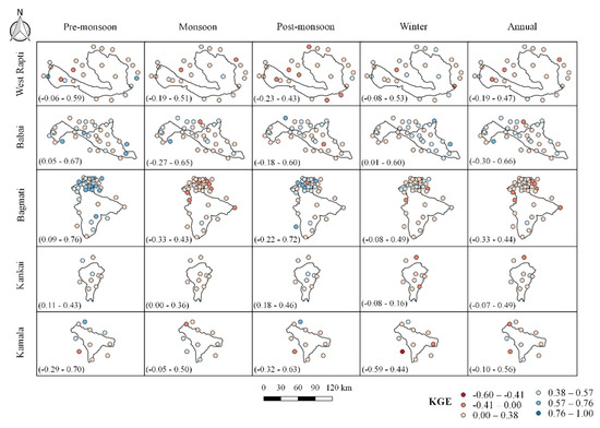 Figure 5 shows the spatial variations of RMSE. No significant trend in the spatial variation of RMSE was seen in all basins. A high RMSE value was seen in the north-eastern part (mainly) of the West Rapti River basin, mostly during the monsoon season. The probable reason can be explained by the fact that satellites are unable to measure extreme precipitation in these areas. In contrast, lower RMSE was obtained in other seasons, which could be related to the increased frequency of no rainfall recorded by both CHIRPS and ground-based observations [60]. In terms of PBIAS, a mix of over and underestimation (Figure 6) was observed in the study area. Among all basins, rain gauge observations of the Babai basin showed good agreement with CHIRPS data. The increase in PBIAS by around 20% could be attributable to the varied topography, which includes flat and elevated regions, resulting in a difference in the performance of satellites even over short distances. Moreover, a challenge that prevails is accurate satellite rainfall estimates over mountainous terrain due to the orographic effect [53]. Figure 7 shows the spatial distribution of KGE. The KGE value for the pre-monsoon period ranged from 0.09 to 0.76 (median = 0.44), 0.04 to 0.67 (median = 0.35), −0.29 to 0.70 (median = 0.25), 0.11 to 0.43 (median = 0.25), and −0.05 to 0.59 (median = 0.27) for Bagmati, Babai, Kamala, Kankai, and West Rapti, respectively. The negative KGE values indicate the poor performance of the satellite products in some stations. The lowest average KGE value was seen in the Kankai (0.05) and Kamala basins (0.09), both in the winter seasons, while the highest was seen in the Bagmati river basin (0.44) in the pre-monsoon season.