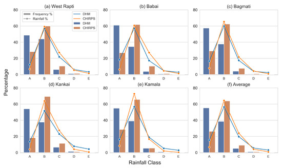 Contribution of rainfall frequency (%) and cumulative rainfall (%) of CHIRPS and rain gauge observations (DHM) for various classes of rainfall rate at different basins, (a) West Rapti, (b) Babai, (c) Bagmati, (d) Kankai, (e) Kamala, and (f) Average. A description of different classes is shown in Table 2.
