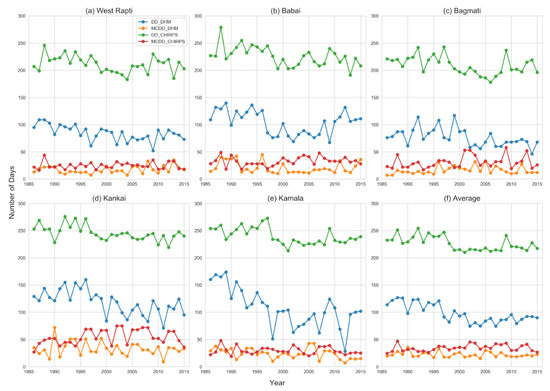 Line plots of temporal distribution (1986–2015) of dry days of DHM (DD_DHM: blue), dry days of CHIRPS (DD_CHIRPS: green), maximum consecutive dry days of DHM (MCDD_DHM: orange), and maximum consecutive dry days of CHIRPS (MCDD_CHIRPS: red) for (a) West Rapti basin, (b) Babai basin, (c) Bagmati basin, (d) Kankai basin, (e) Kamala basin, and (f) Average of all five basins.