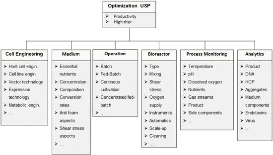 Process development and optimization in USP includes various parts: cell line development and engineering, cell clone selection, media and feed development, bioprocess development and scale up [5,9,42,43,44]. Reactor design, cell harvesting, process control and the corresponding analytics can be part of the optimization process as well [9,42,43]. These areas are optimized individually and focus on a robust generation of a high product titer, high productivity and defined quality [5,6,43]. Figure 1 schematically presents the different optimization areas and lists the most important parameters. Following process development, process characterization, process transfer and set up of a cGMP-production take place in combination with process validation [5].