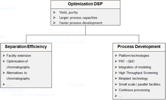 DSP development focusses on yield and productivity as well as on purity and process capacities. An increase in separation efficiency of single unit operations is achieved by expansion of existing facilities and by optimization of existing and alternative processes [2]. New methods for process development are under investigation. These include the establishment of platform technologies, high-through-put methods with approaches based on QbD and DoE-based experimental optimizations [2,21,36]. Additionally, an integration of modeling and simulation of unit operations as well as the use of mini-plant facilities is applied in process development (see Figure 2).