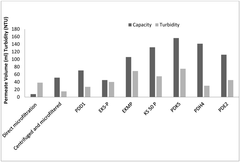 In all cases, turbidity of the feed solution was measured by light scattering using Hach Ratio Turbidimeter (Hach, Loveland, CO, USA).Turbidity was also monitored during all microfiltration and depth filtration experiments. A sample of feed was placed in the cuvette and its turbidity examined. Similarly, the permeate samples from different depth filters and micro filters were also examined.