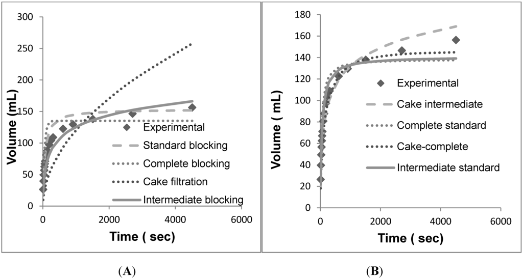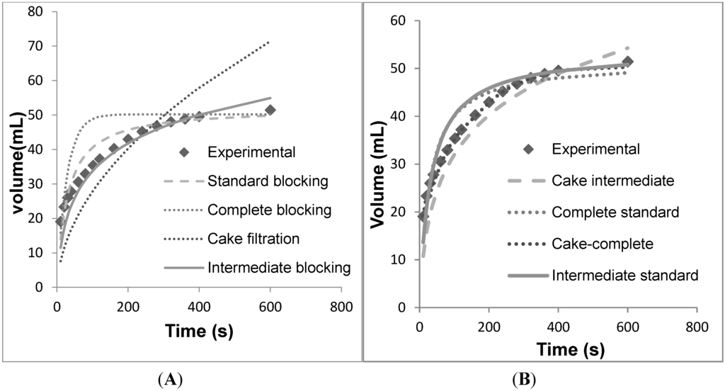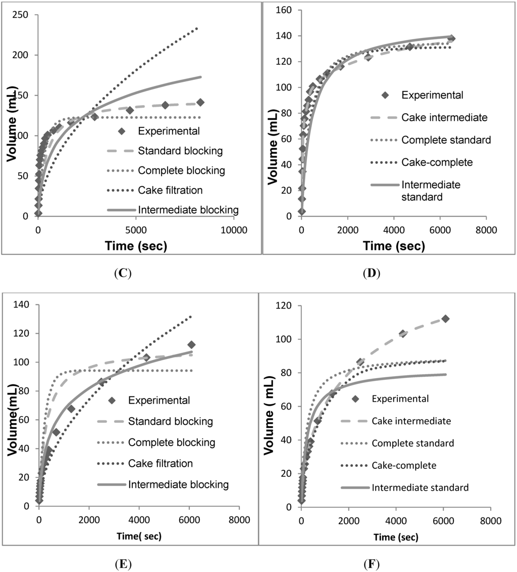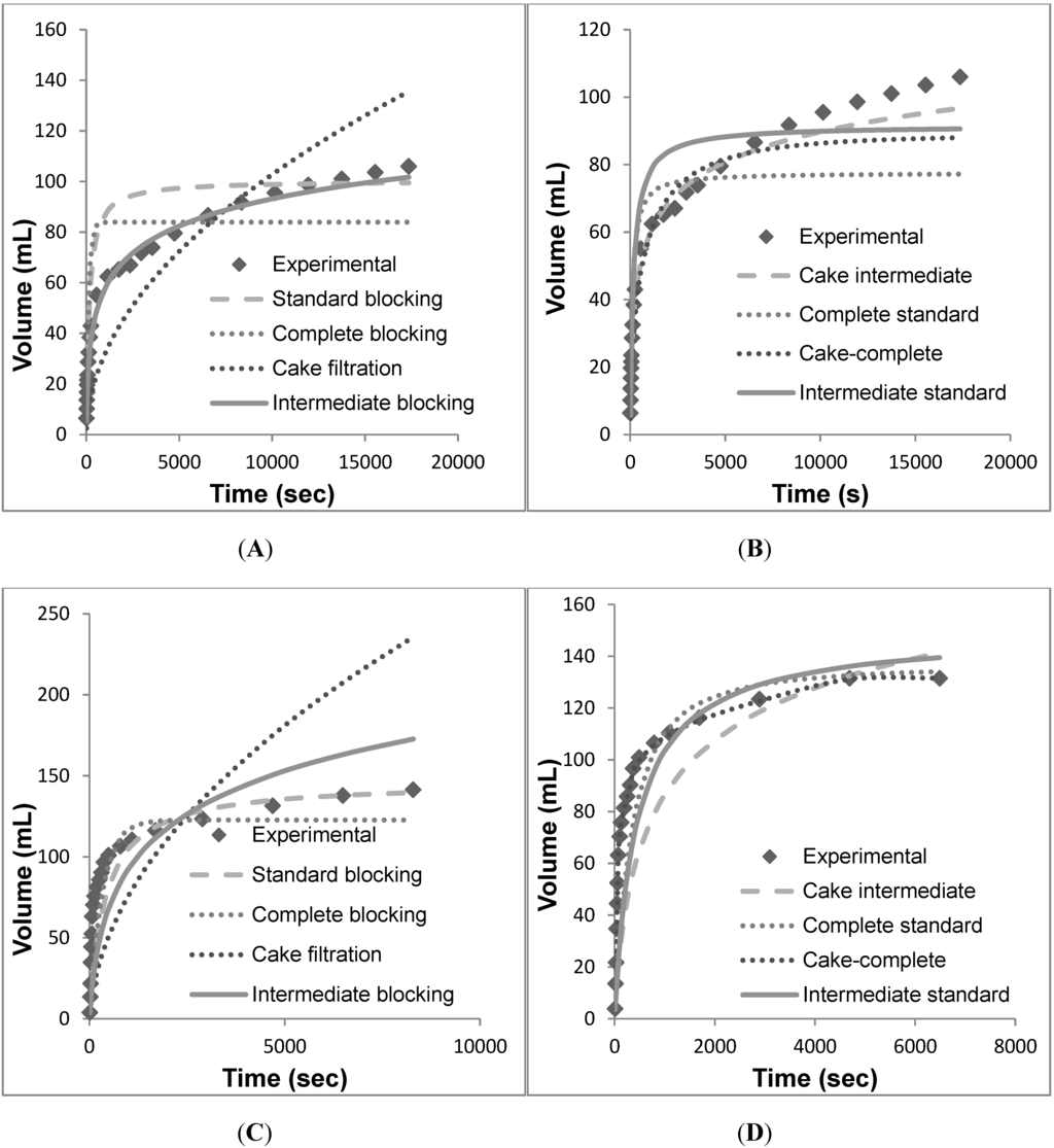 The fermentation broth was centrifuged at 8000 rpm for 30 min and then used for evaluation of the micro-filters. As mentioned above, the mean particle size was much smaller as compared to the pore diameter of the membrane. For the EKV filter, none of the four individual models mentioned above were able to explain fouling (Figure 4A). Of the four models, the intermediate blocking model provided the best fit for the data. However, significant deviations are observed between the intermediate blocking model and the experimental data, especially at the start of the operation and towards the end of the operation. This indicates that perhaps there are multiple mechanisms that are participating in the fouling of the EKV filter (as shown in Table 2).
