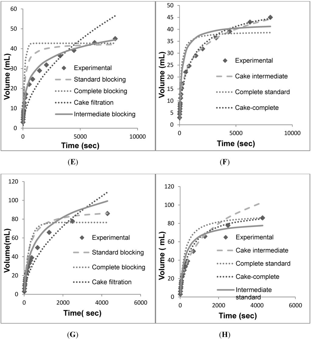 Hence, various combinations of the four models were tested for fitting of the experimental data for all cases. It is observed that a combination of intermediate blocking and cake filtration models provides the best fit for three of the cases (PDK5, PDH4 and PDE2), while the combination of complete blocking and cake filtration provides the best fit for PDD1,EKSP, EKMP and KS50P. A review of the information about these filters (Table 1) suggests that EKMP, EKSP, PDD1and KS50P have relatively smaller pores (0.1–0.8 µm), while PDK5, PDH4 and PDE2 have much larger pores (0.2–20 µm). Hence, it is likely that the particles tend to either completely block the pores (as in complete blocking of smaller pores) or gradually block them (as in intermediate blocking or larger pores). Eventually, as time passes by cake filtration emerges as the dominant mechanism of filter fouling.