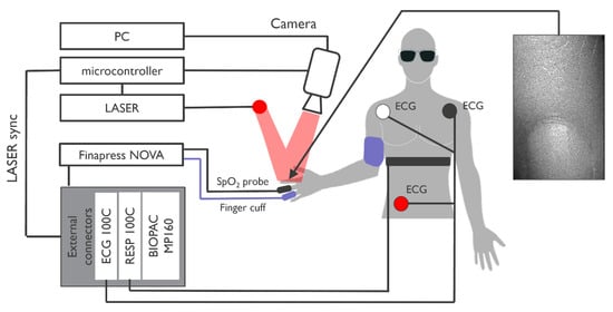 A Biopac MP160 was used to record reference ECG, respiration from a chest belt (Polar), the PPG and fiAP signals coming from Finapres NOVA and the common trigger pulses for the laser and camera (for synchronization).