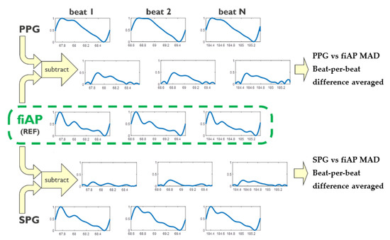 The morphological analysis consisted of the following steps (see also Figure 2): First, upstrokes were calculated from PPG, SPG and reference signal (fiAP). Then, PPG, SPG and reference signal (fiAP) were normalized beat-to-beat, by the maximum and minimum of each beat. After this, PPG as well as SPG were subtracted from the normalized fiAP signal to obtain respective PPG and SPG absolute deviations. Finally, the signal difference of PPG and SPG with fiAP was averaged for each beat, producing MAD values. For visualization purposes, boxplots of MAD beat-averaged were generated for PPG as well as for SPG (Section 4).