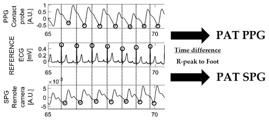PPG PAT has been investigated as a marker for arterial stiffness and BP assessment [11,19]. Remote reflective SPG has shown results comparable to contact transmissive PPG, which might allow for PAT calculations at body locations where the PPG quality is compromised, at body locations where contact should be avoided or simply to improve comfort. This investigation was performed using a finger-clip transmissive PPG sensor. In wearable technologies, reflective measurements are preferred (as they allow greater freedom at the measurement site) but have a lower SNR for PPG, whereas SPG excels in reflection mode [16].