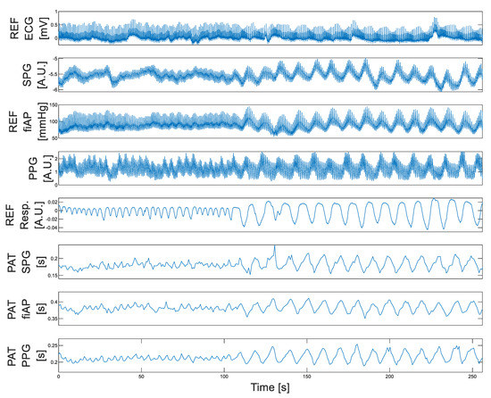 Figure 4 shows an overview of the measured signals from one subject during spontaneous (up to ~105 s) and paced breathing (after ~105 s). In this figure, variations in all signal traces are clearly appreciated between periods of spontaneous and paced breathing. It is important to notice that these variations differ for each signal. Note that paced breathing-induced changes in blood pressure are clearly depicted in the PPG–DC values and SPG–DC values. In addition, paced breathing leads to variations in PAT, observed for all signals (fiAP, SPG and PPG). The analysis of the PAT results is contained in Section 4.2.